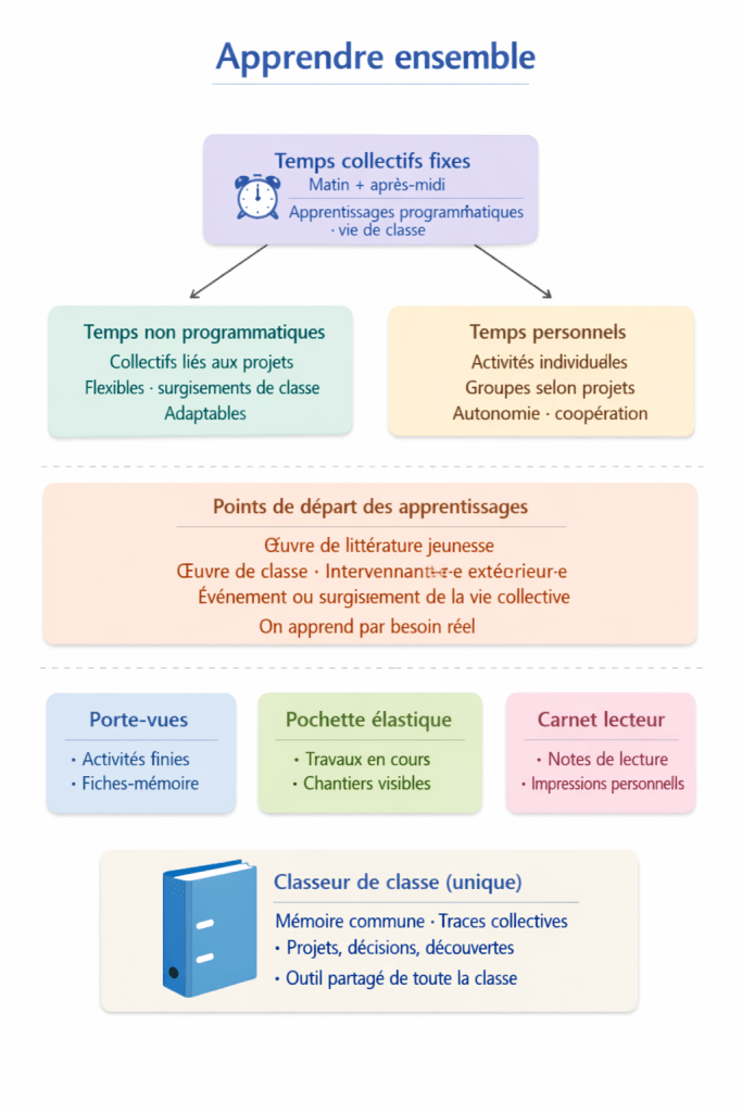 Pour éviter la dispersion, les outils sont volontairement limités. Chaque élève dispose d’un porte‑vues pour conserver les activités terminées et les fiches‑mémoire, d’une pochette à élastiques pour les travaux en cours, et d’un carnet de lecteur·trice pour garder trace des lectures. La classe, elle, possède un seul classeur collectif : c’est la mémoire commune, le lieu où se rassemblent les traces, les projets, les découvertes, les décisions.